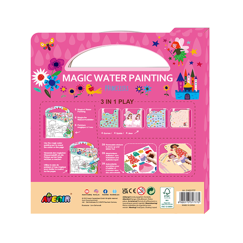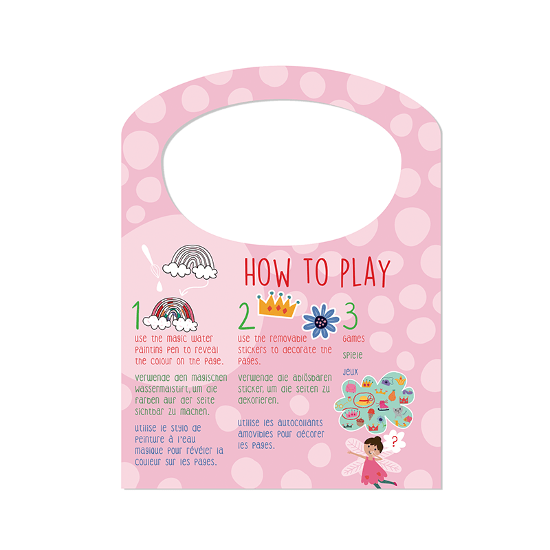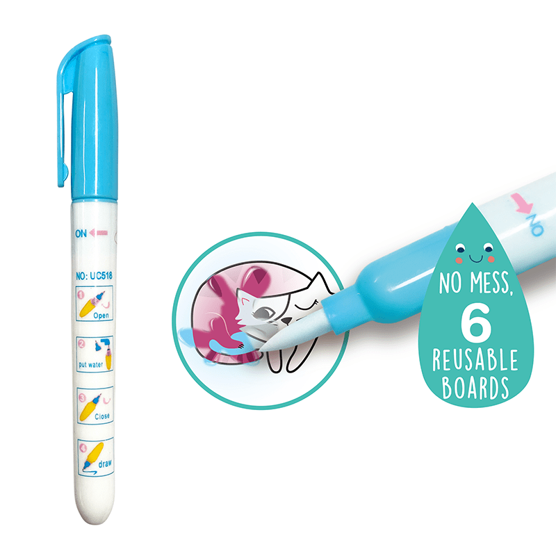 Each book includes 6 reusable colouring surfaces and two sheets of repositionable stickers of themed activities and a refillable water pen. Fill the water pen with regular tap water, then draw to reveal the colour on the pages. It will disappear when the water dries, then you can start again, just like magic!