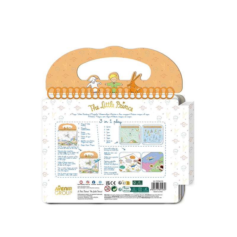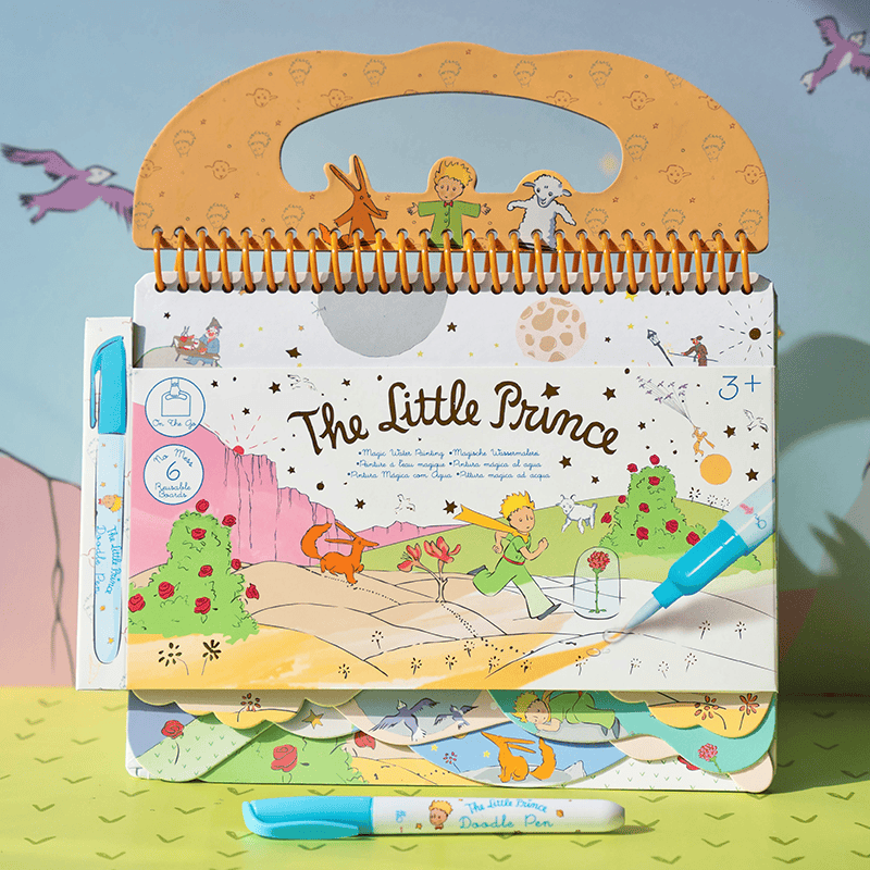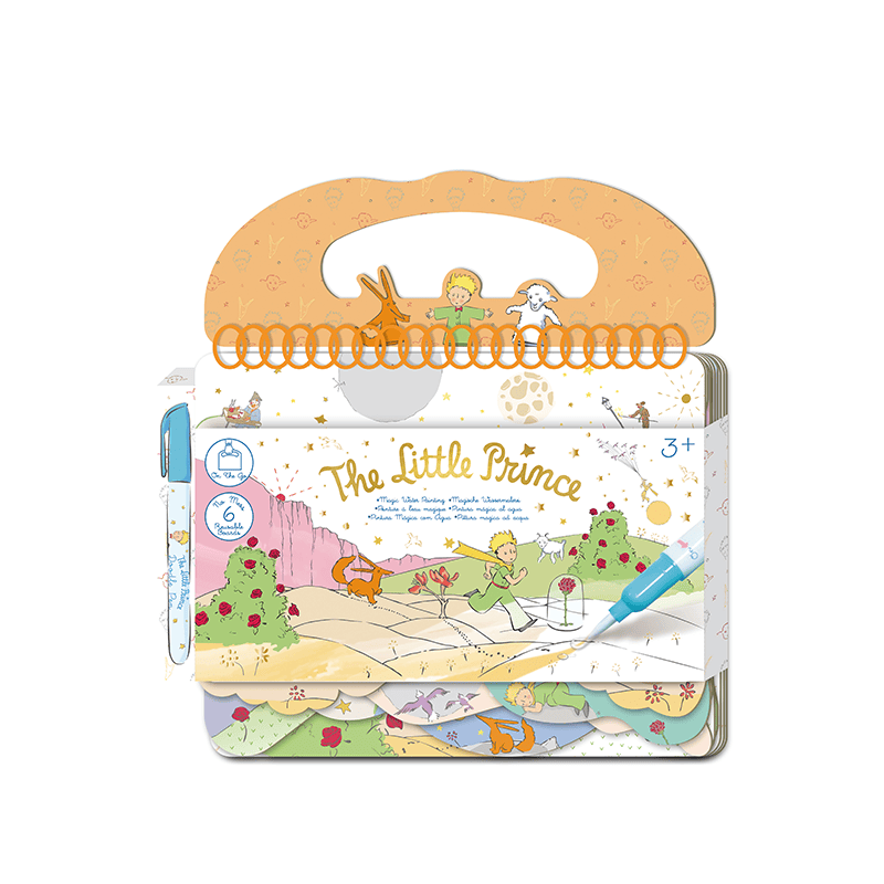 The Little Prince Magic Water Painting is a reusable activity book for children aged 3 and up, featuring 6 themed pages that come to life with a refillable water pen. With illustrations inspired by The Little Prince, children can reveal hidden scenes, play matching games, and follow traceable paths over and over again. Designed in a handy spiral-bound format with a carry handle, it is perfect for travel and mess free fun. It encourages creativity, focus, hand eye coordination, and cognitive development all in one interactive and reusable set.