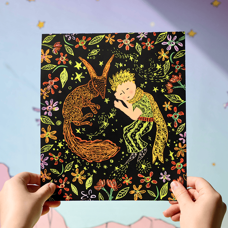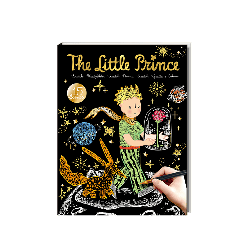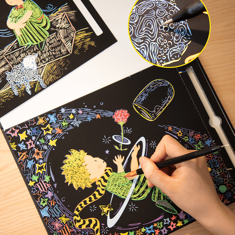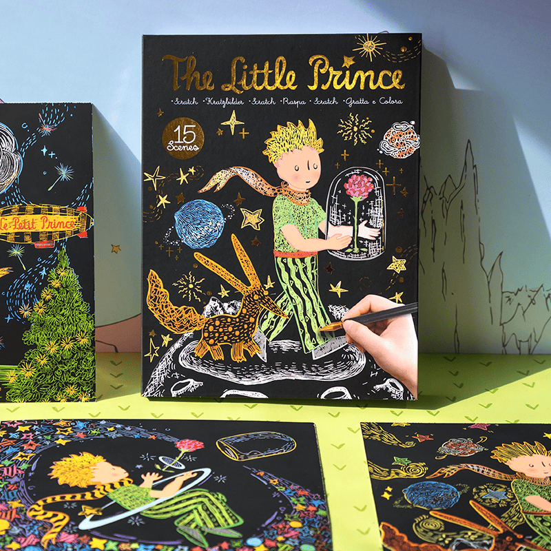 The Little Prince Scratch Book is a magical art activity for children aged 3 and up, featuring 15 beautifully illustrated scratch scenes inspired by The Little Prince. With just the included wooden stylus, kids can scratch away the black surface to reveal colorful cosmic and storybook designs underneath. The book-style format makes it easy to use and perfect for travel or quiet time. It encourages creativity, concentration, hand control, and imaginative exploration all in one enchanting and mess free set.
