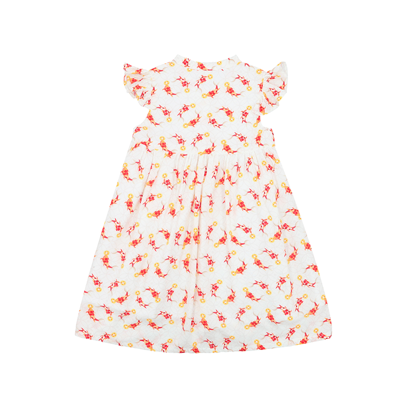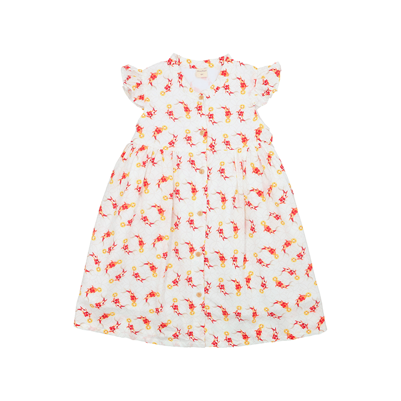 CNY Girl Dress Ruffle Sleeve Button Down Abundance Koi (Beige)