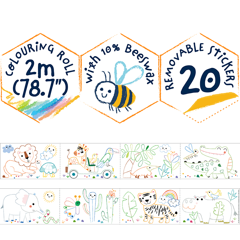 Haku Yoka Colouring Roll Kit includes a 2 metre long roll colouring sheet, and 4 pieces of Hi-Pea crayons. Each design has different concept. The Vehicle concept is to colour and decorate with stickers. An easy and fun way to roll it out from box, and kids can tear the roll off every20cm helped by the pre-punched dotted line, Colouring in creative way, sharing with friends!